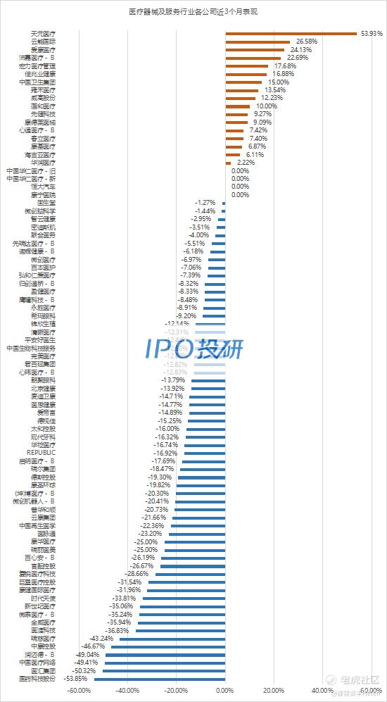 近3个月涨幅最大的是天元医疗(00557.HK),涨幅为53.93%;跌幅最大的是国药科技股份(08156.HK),跌幅为-53.85%。