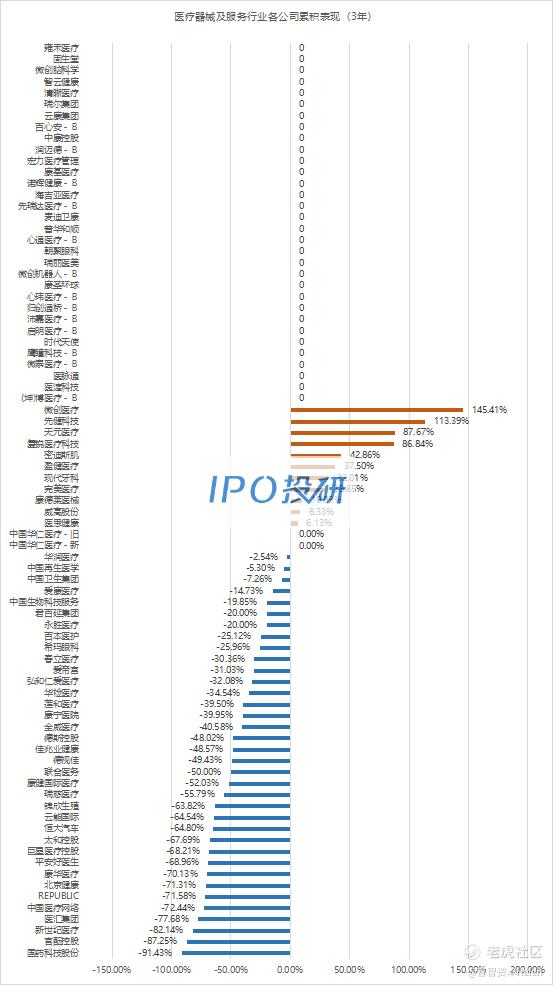 累计表现涨幅最大的是微创医疗(00853.HK),涨幅为145.41%;跌幅最大的是国药科技股份(08156.HK),跌幅为-91.43%。