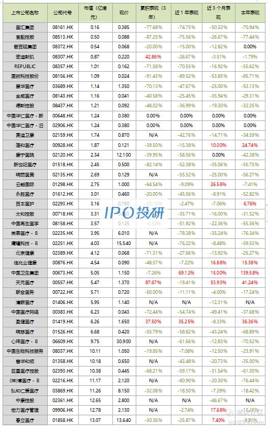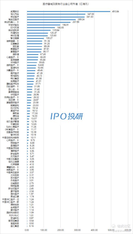 3、市值最高的是威高股份(01066.HK),市值为493.84亿元;市值最低的是医汇集团(08161.HK),市值为0.16亿元。