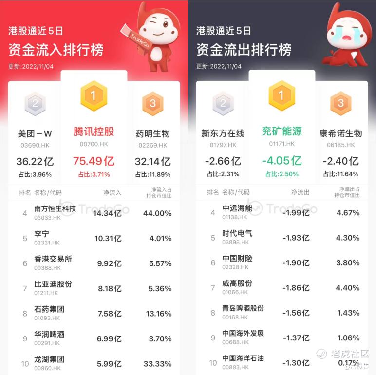 近5日港股通资金流入个股前三位分别为腾讯控股、美团-W、药明生物,净流入金额分别达75.49亿港元、36.22亿港元、32.14亿港元,此外还净流入南方恒生科技14.34亿港元,净流入占港股通持仓市值比达44%;