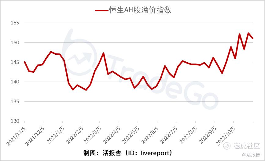 AH股溢价指数周环比有所回落,但仍处于历史最高水位附近,港股较A股低估明显。截至2022年10月28日,恒生AH股溢价指数(HSASP.HI)报151.04,周环比涨幅为-0.91%,仍处于2014年沪股通开通以来的历史最高水位附近。