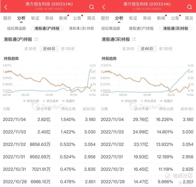 捷利交易宝数据显示,今年10月下旬以来,港股通持有南方恒生科技的比例呈现快速上升的趋势。截至11月4日,港股通(沪)持仓市值约2.82亿,持仓比例1.54%;港股通(深)持仓市值约29.76亿,持仓比例16.23%。
