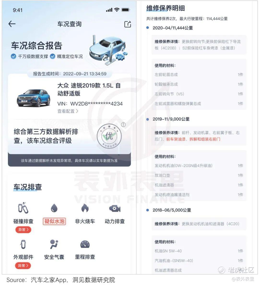 可以看到,汽车之家二手车板块可提供面向B端和C端的车况查询服务,其中包括查维保――查询报告包含了详细的历史维修记录、保养记录、里程信息等。