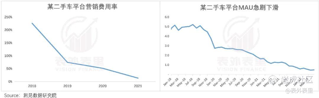 以某已上市的二手车互联网公司为例,2018年营销费用率为225.9%,MAU维持在500万左右。从2019年开始调整营销费用,随之而来的是MAU急剧下滑。