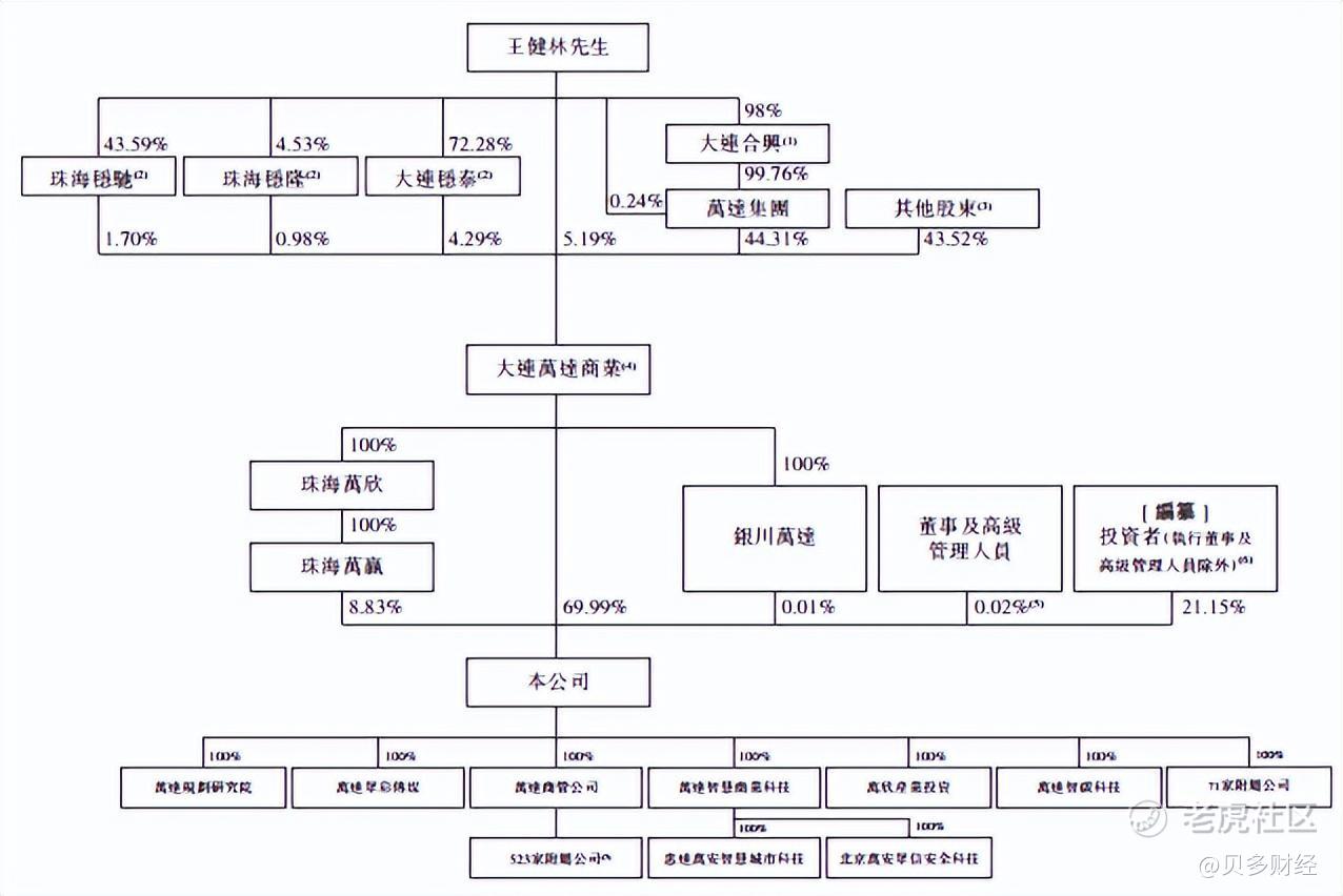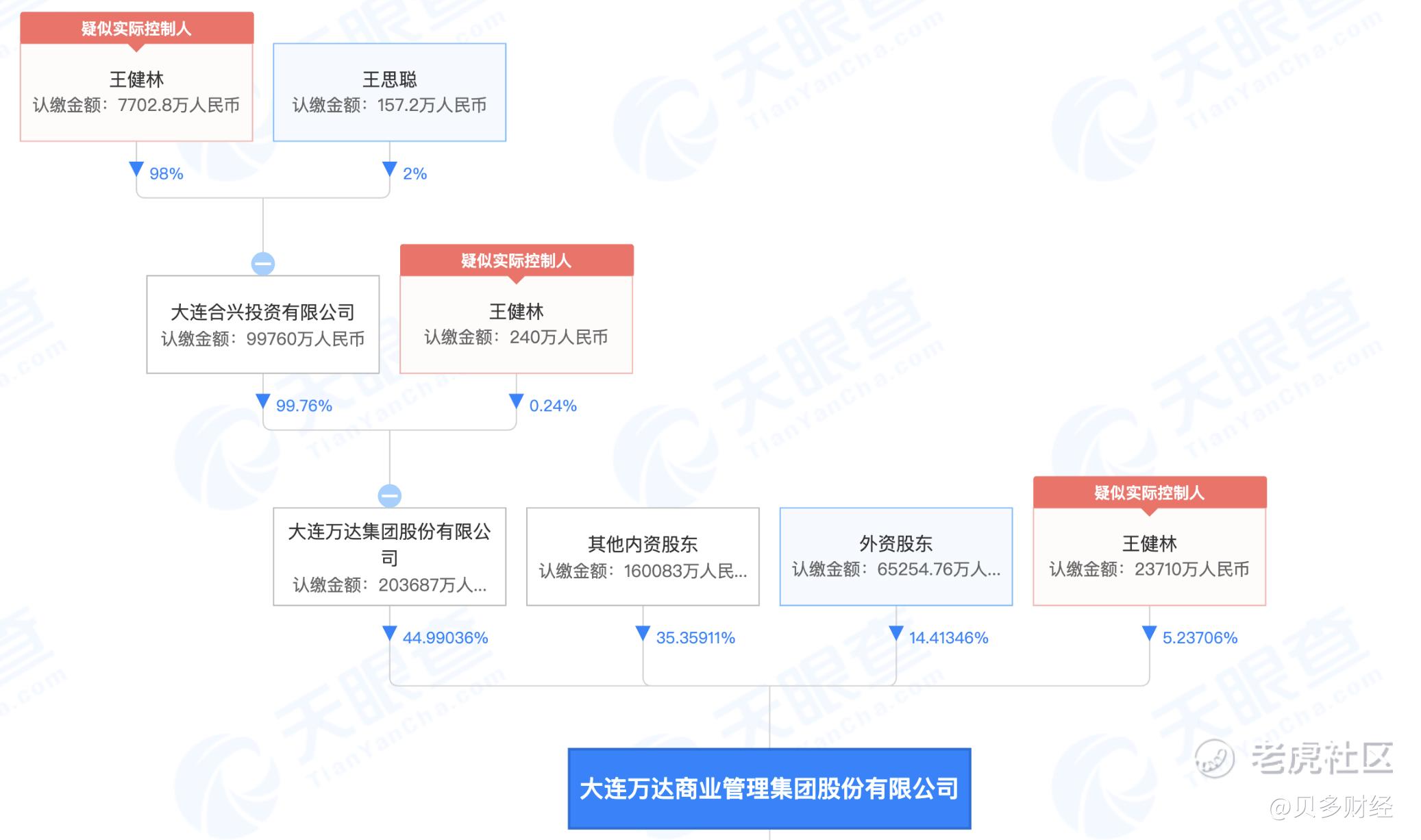 同时,珠海稳驰持有大连万达商业1.70%的股份,珠海稳隆持股0.98%,大连稳泰持股4.29%,万达集团持股44.31%,其他股东持股43.52%。其中,王健林持股98%的大连合兴直接持有万达集团99.76%股权,大连合兴的其余2%股份由王健林之子王思聪持有。