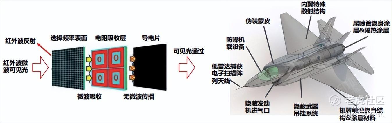 图:MSM 的隐身机制(可见光- 外-雷达波段的兼容隐身性能)(左图);先进战机隐身设计材料应用(右图)
