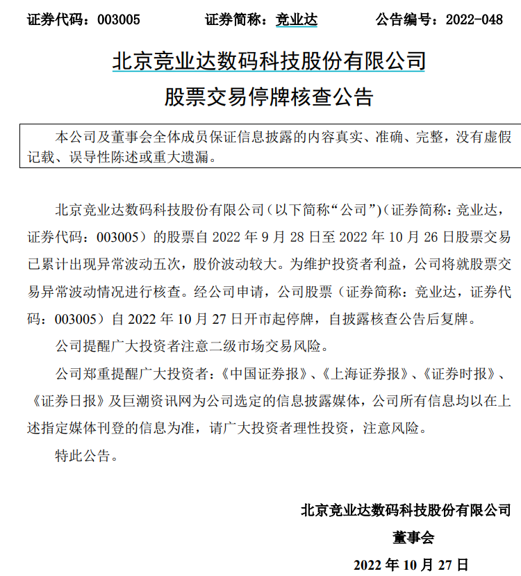 竞业达公告,自2022年9月28日至2022年10月26日股票交易已累计出现异常波动五次,股价波动较大。为维护投资者利益,公司将就股票交易异常波动情况进行核查。经公司申请,公司股票自2022年10月27日开市起停牌,自披露核查公告后复牌。