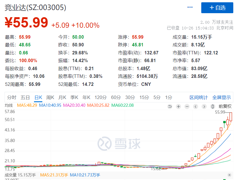 该公司9月28日首板以来,截至10月26日该股已录得15天10板,累计涨幅达246.69%,总市值增加58.96亿元。而自9月28日以来,竞业达前后发布5次股价异动风险提示,并在10月16日晚间收到深交所下发的关注函。