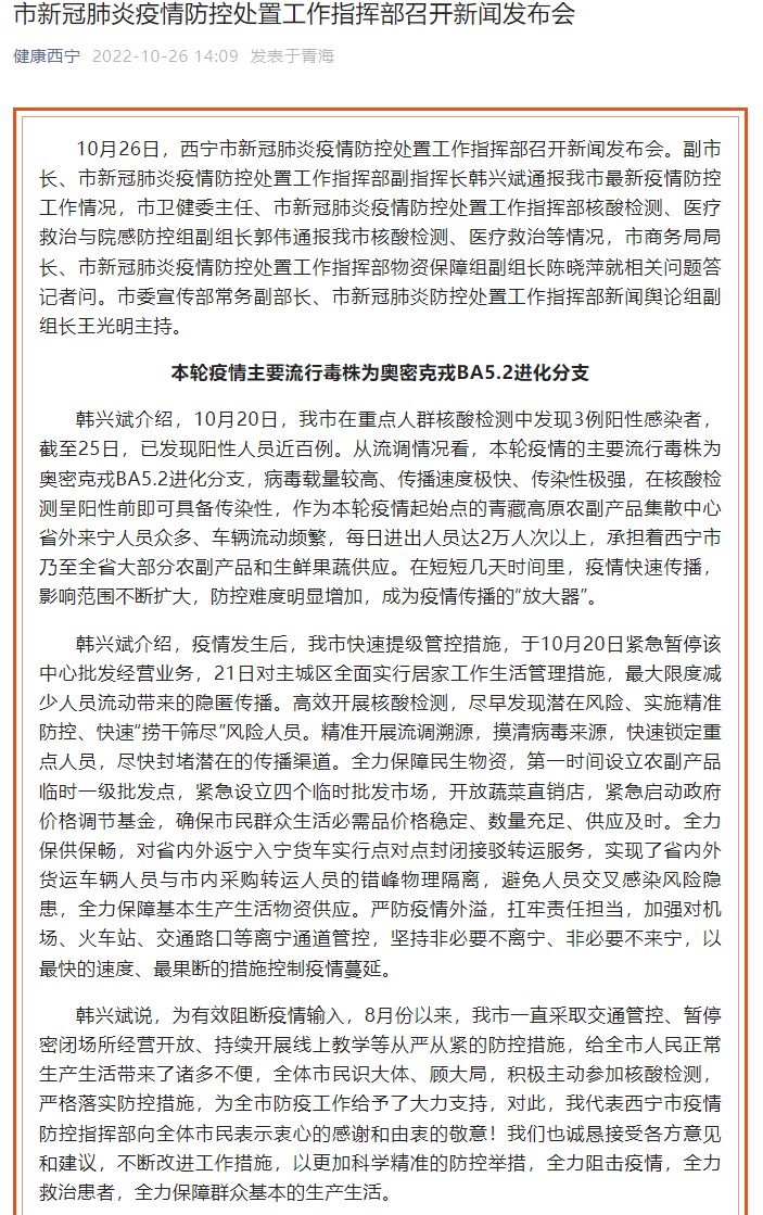 26日,西宁市疫情防控处置工作指挥部召开新闻发布会。市商务局局长、市疫情防控处置工作指挥部物资保障组副组长陈晓萍表示,少数群众反映买菜难、排队时间长,主要原因是市区蔬菜水果销售店铺大多是从集散中心进货,有高风险地区接触史,为降低传播风险对部分蔬果店实施了闭店隔离,待3-5轮核酸检测结果阴性后,满足防控和保供条件的可逐步开放。此外,全市各级政府对粮、油、肉都由政府储备,在紧急情况下,也可以调运至市场,保证生活必需品的供应。