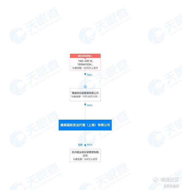 但据天眼查信息,德威国际货运代理(上海)有限公司成立于2007年,是一家以从事道路运输业为主的企业。当前,该公司的注册资本为1137.36万元,法定代表人为程芳,由德威供应链管理有限公司全资控股,背后为德威物流(香港)。