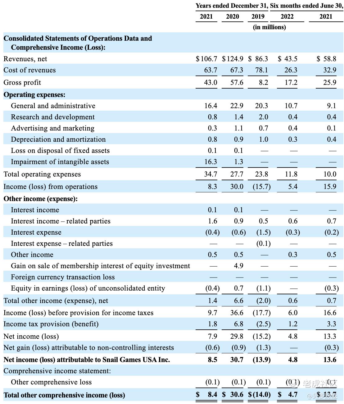 2022年上半年,蜗牛游戏的收入为4350万美元,2021年同期为5880万美元,同比减少26.02%;净利润为480万美元,2021年同期为1360万美元,同比减少64.71%;调整后EBITDA为610万美元,2021年同期为1640万美元,同比减少63.41%。