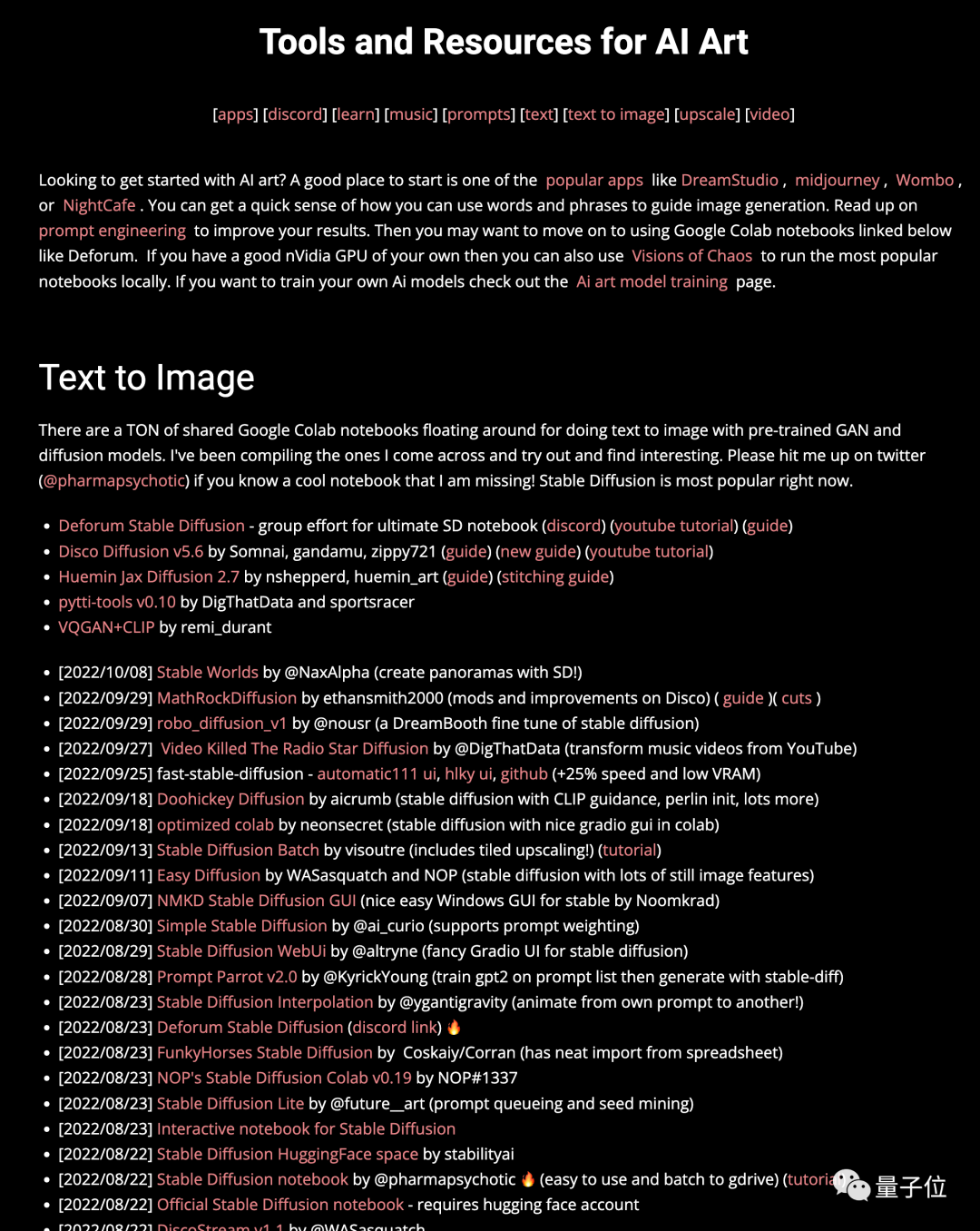 在作者的个人网站上,还收集了从去年7月以来诞生的AI艺术相关工具和资源大全。