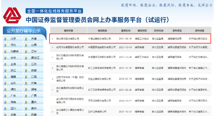 证监会公开发行辅导系统亦显示,中信证券已完成湖对北银行首发上市辅导,并向湖北证监局申请对湖北银行的上市辅导工作进行验收。