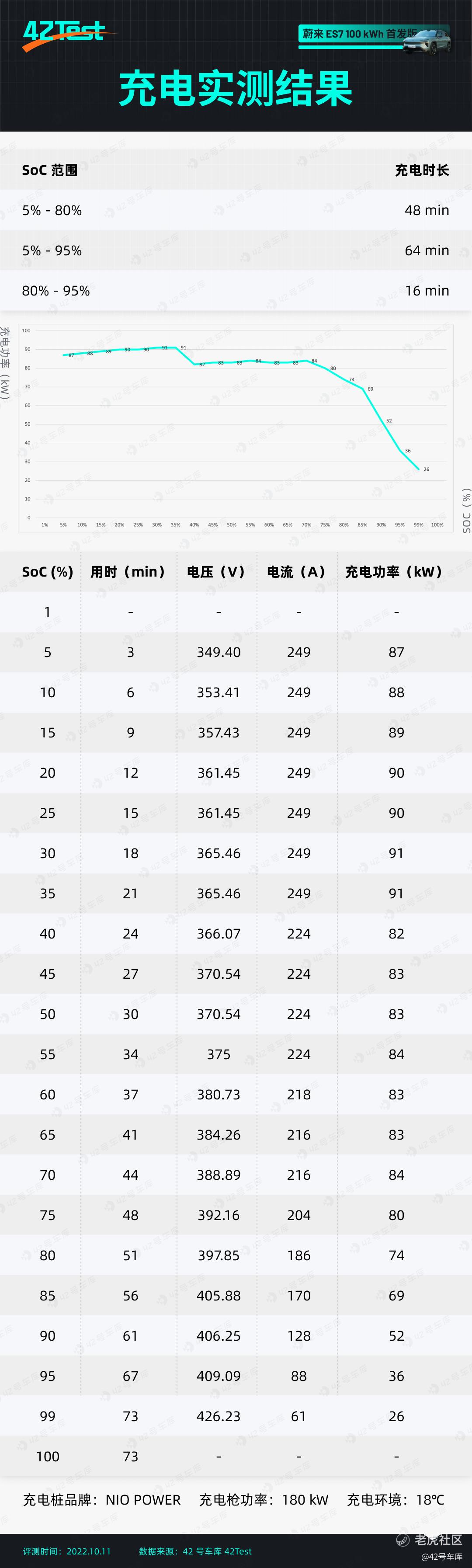 可以看到,ES7 虽然峰值功率更低,但得益于更大的电池,维持在较高功率的时间更长,不同阶段的充电时间与 75 kWh 的 ET5 相差并不大,最后 5% 阶段的时间甚至还反超了。