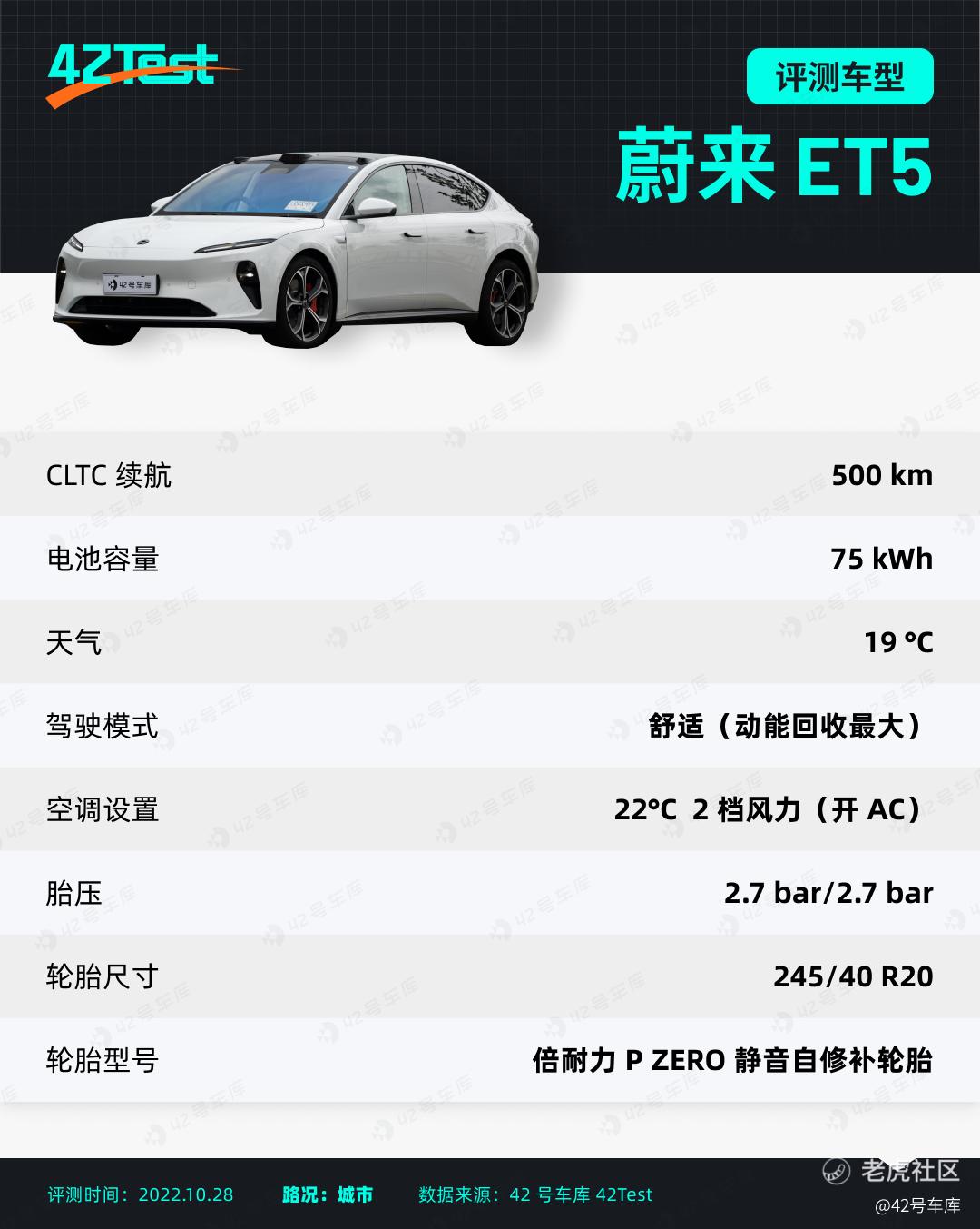 本次 42Test 的车型版本是蔚来 ET5 75 kWh 电池版本,选装了 20 英寸五辐花竞轮圈,官方 CLTC 综合工况续航 500 km。
