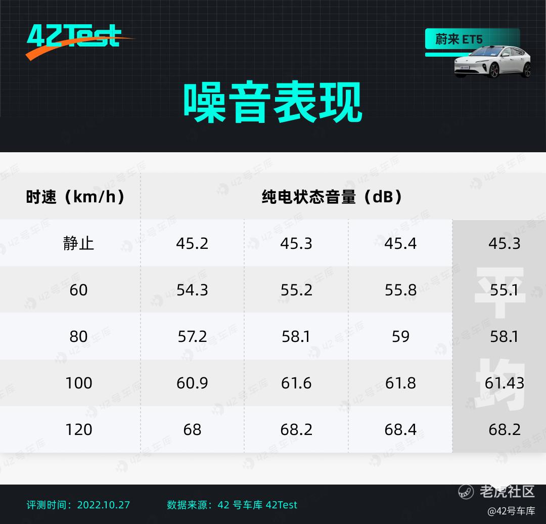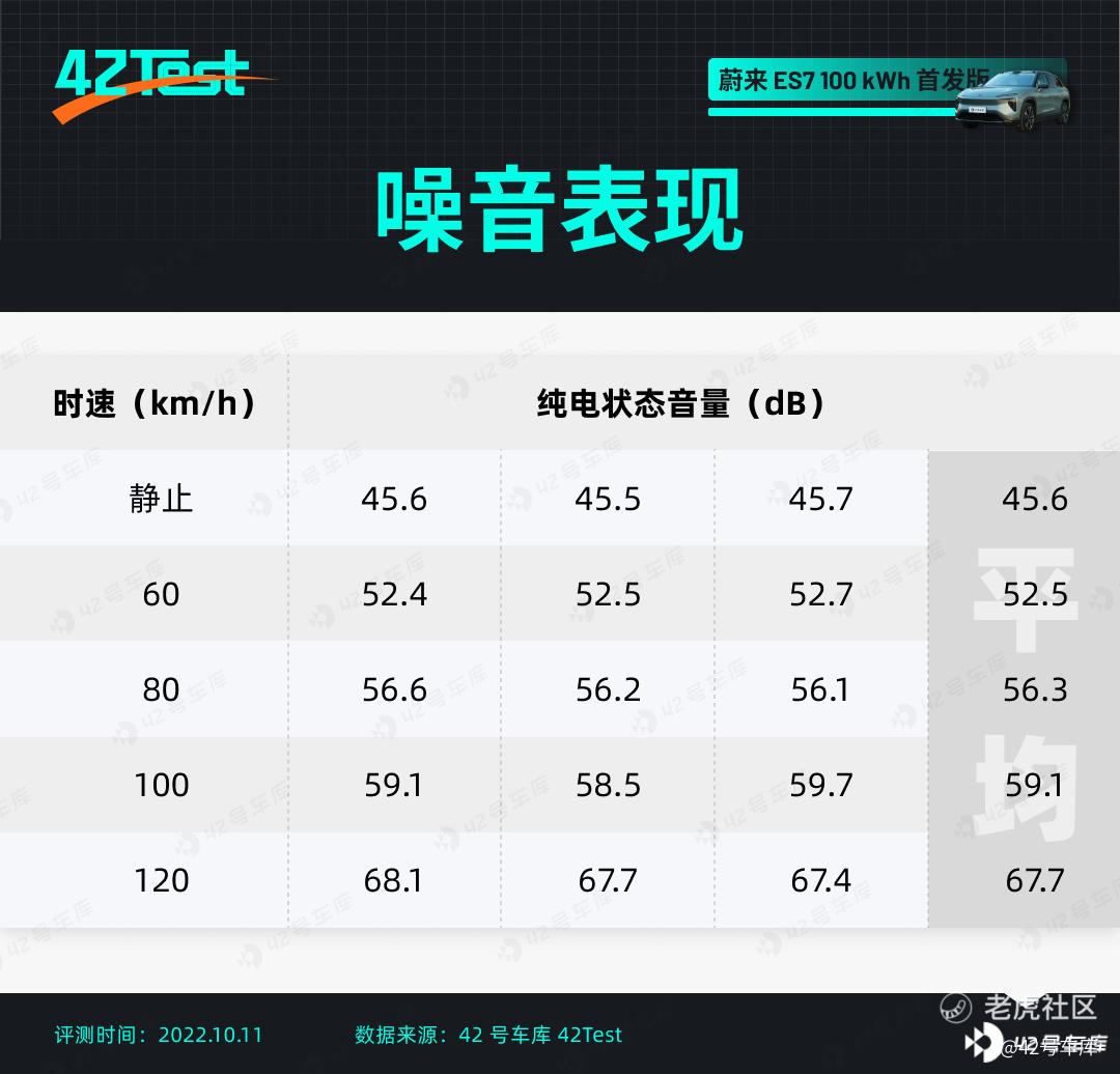 由于我们没有详细测试 ET7 的噪音水平,作为参考,我这边放的是采用了双层夹胶玻璃的 ES7 噪音数据供大家参考。总体来说成绩比 ET5 要好一些,但毕竟是 SUV ,车型的差异导致更大的风阻也会导致车内噪音增加一些。