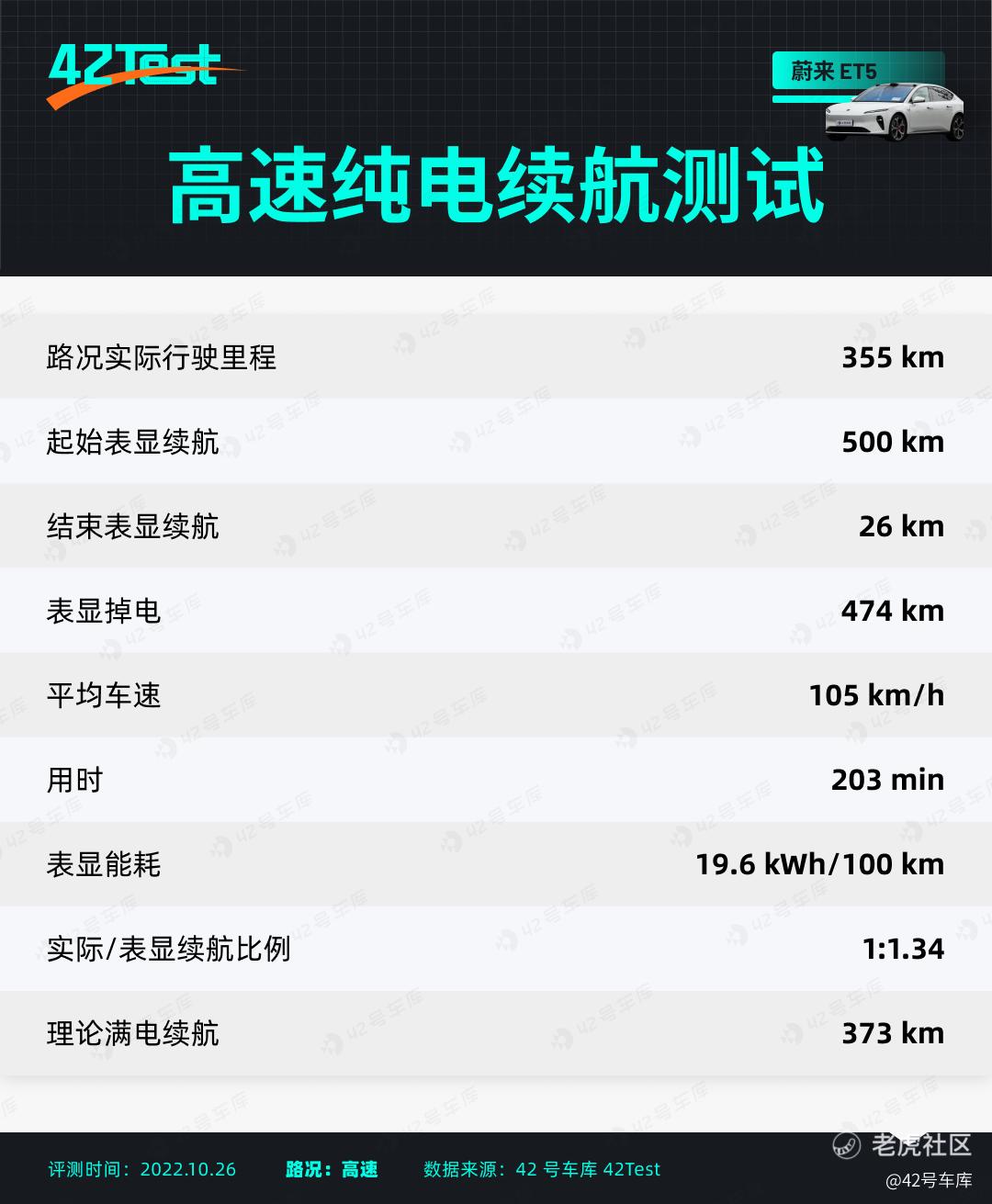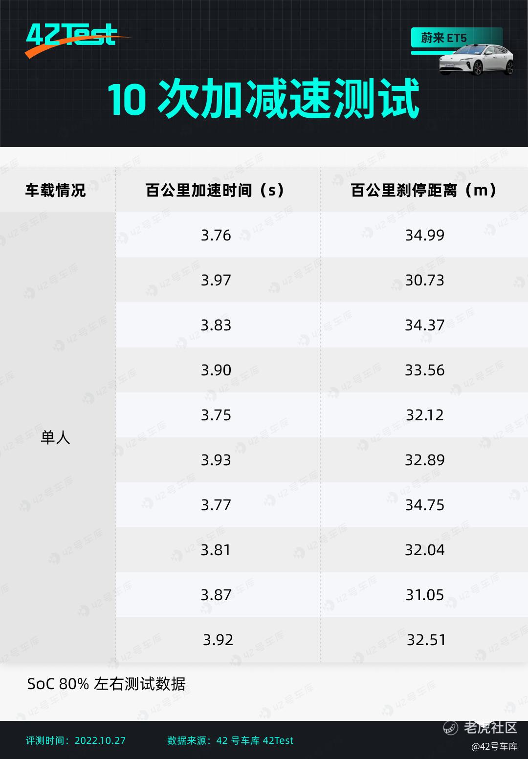 由于蔚来官方测试数据始终采用「半载测试」,而我们 42Test 性能测试采用的是「单人测试」,所以理论上会得出比官方成绩更好的数据。那么这次 ET5 上还会不会出现「反向虚标」呢?