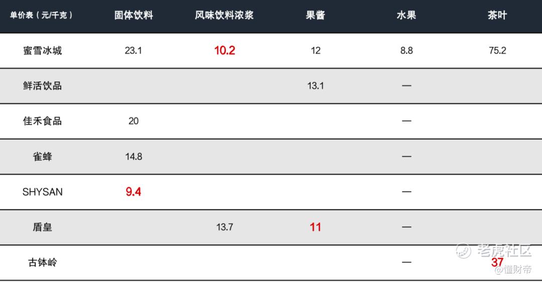对比之下,蜜雪冰城仅在风味饮料浓浆售价上占优势。加盟商为了省钱,有可能寻求别的食材采购渠道。