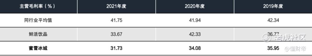 针对近年营收情况,招股书给出了数据。蜜雪冰城2019-2021年,主营业务毛利率分别为 35.95%、34.08%、31.73%。同行业可比公司2019-2021年,主营业务毛利率平均值分别是42.34%、41.94%、41.75%。