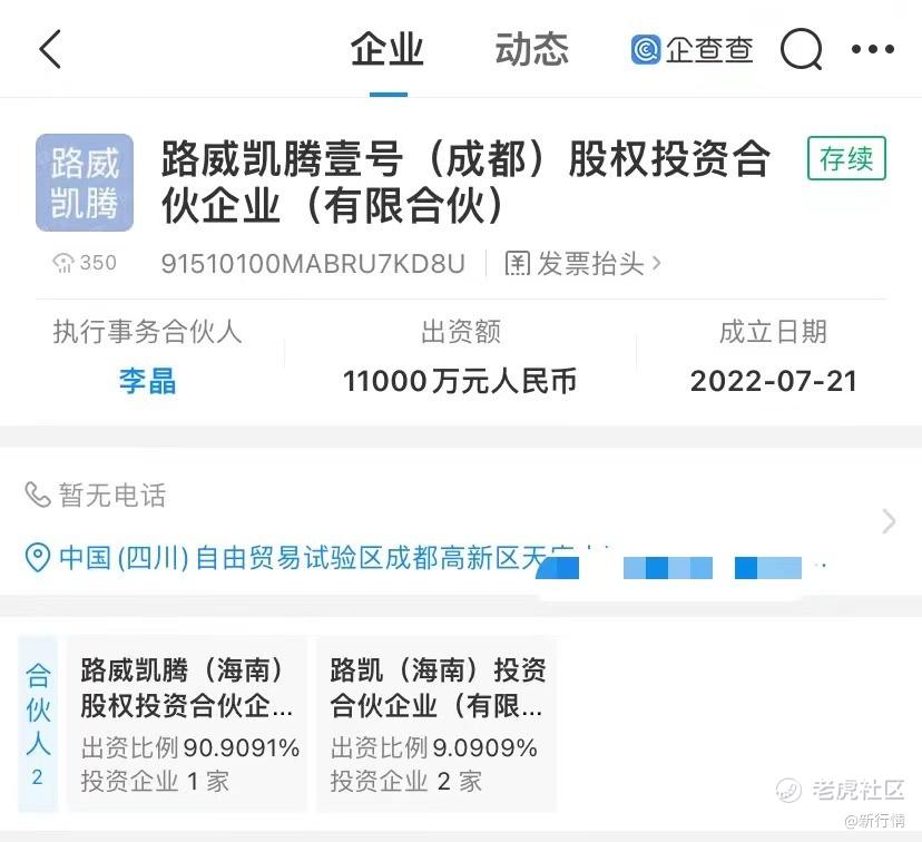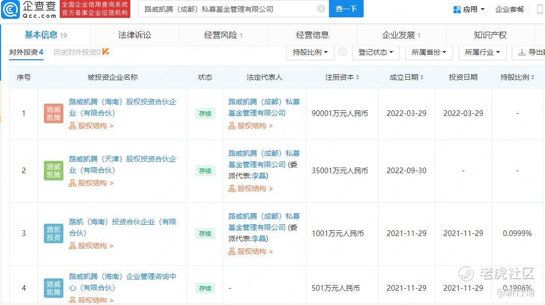 企查查APP显示,2022年7月,路威凯腾壹号(成都)股权投资合伙企业(有限合伙)于成都高新区成立,注册资本1.1亿元,经营范围含以私募基金从事股权投资、投资管理、资产管理等活动等,该公司由路威凯腾(海南)股权投资合伙企业(有限合伙)、路凯(海南)投资合伙企业(有限合伙)共同持股。