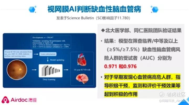 视网膜影像AI判断缺血性脑血管病。这也是发表在我们中国科学院主办期刊《Science Bulletin》的一篇论文,SCI影响因子达到11.78。由北大医学部和同仁医院团队验证的结果显示,(模型)对于早期发现心血管病的高危人群,指导积极干预,监测和评价干预效果等起到积极的作用。