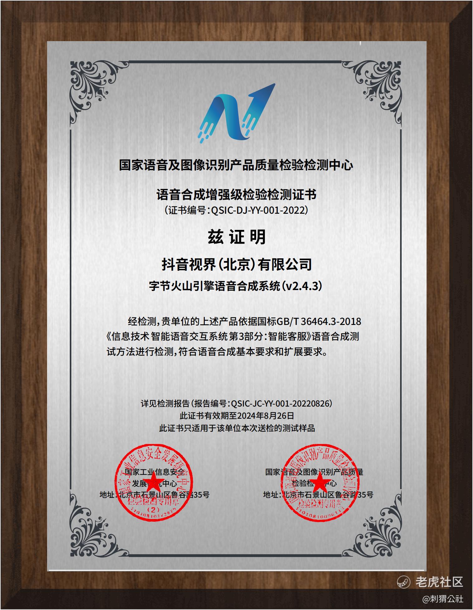 作为我国质检系统在人工智能领域的首家、也是唯一的国家级语音及图像产品质量检验检测机构,AI 国检中心一直致力于推动智能语音产业的健康发展。本次获得AI国检中心的权威认证,也充分表明了火山语音的语音合成技术能力已达到行业领先水平。