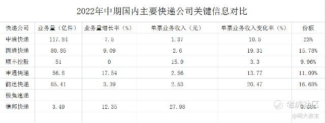 国家邮政局官网显示,2022年上半年,我国快递业单票收入出现近12年来的首次反弹,单票业务恢复至约9.72元/件!不过,快递业趋于同质化竞争,参与企业众多,单票价格继续上浮的空间并不大。