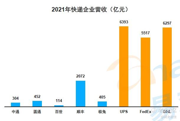 从营收角度看,2021年国内营收最高的顺丰仅为全球快递三巨头平均水平的三分之一。