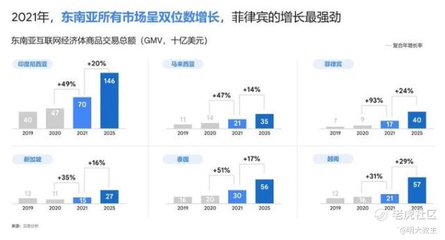 2021年,印度尼西亚、马来西亚、菲律宾、新加坡、泰国、越南GMV同比均高速增长。