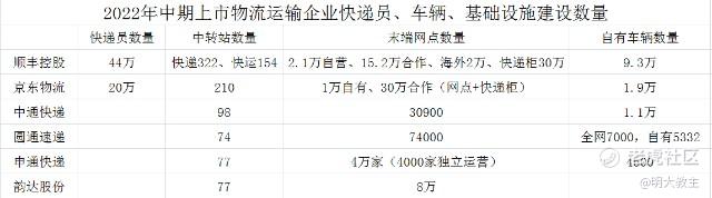 翻阅A股各快递物流企业2022年中报数据,我们不难看出,快递企业仍在追加物流园区、自动分拣设备等资本投入。较为核心的“末端网点数量”、“自有车辆数量”方面,上市物流企业同比均有所增长。