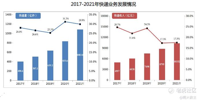 2021年,我国快递业总量超千亿件,总收入超万亿元。但行业收入增速却从2019年的24.2%下降至2021年的17.5%。同年,我国快递出海市场规模仅2000亿元左右(含国际跨境快递、专线物流、海外仓、邮政小包等),海外业务收入/占比,均低于UPS、DHL等海外快递巨头,快递企业国际竞争力亟待提升。