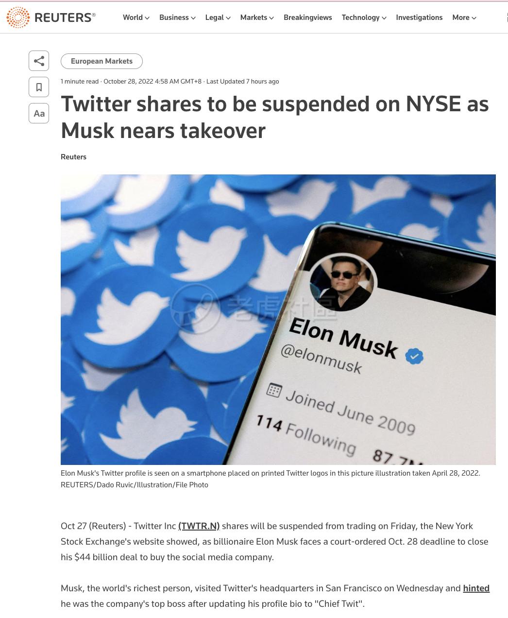 北京时间10月28日上午消息,据路透社,华盛顿邮报报道,埃隆·马斯克(Elon Musk)已经完成对$Twitter(TWTR)$ 公司440亿美元的收购。在经历了6个月的反复后,这位全球首富终于入主这家陷入困境的社交网络。马斯克出价每股54.20美元从推特股东手中购买该公司股票,将推特从上市公司变成一家私有公司。该交易的完成为这场错综复杂的事件画上了句号。