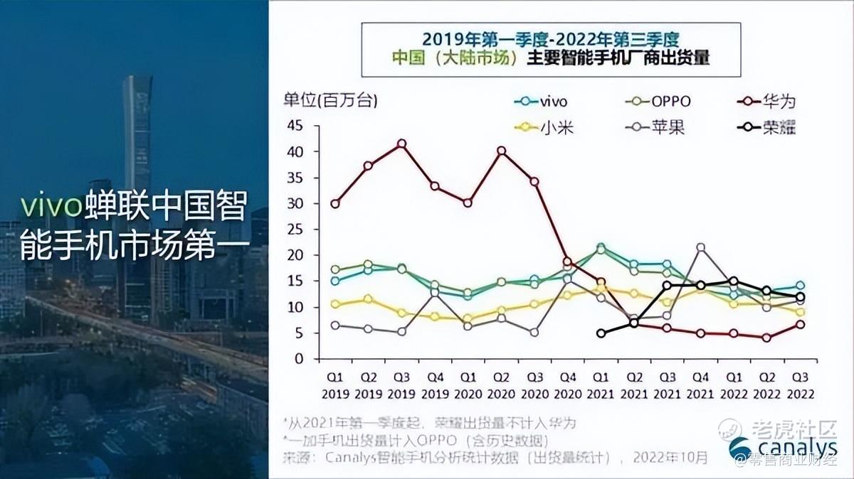 10月27日,调研机构Canalys发布中国大陆智能手机市场报告,报告显示,2022年第三季度,中国智能手机市场出货量7000万台,同比下跌11%。具体来看,vivo以1410万台出货量蝉联第一,也是国产厂商中出货最高的品牌,OPPO(含一加)出货1210万台,排名第二,荣耀位列第三,出货1200万台。苹果和小米则分别以1130万台和900万台的出货,分列第四、第五。