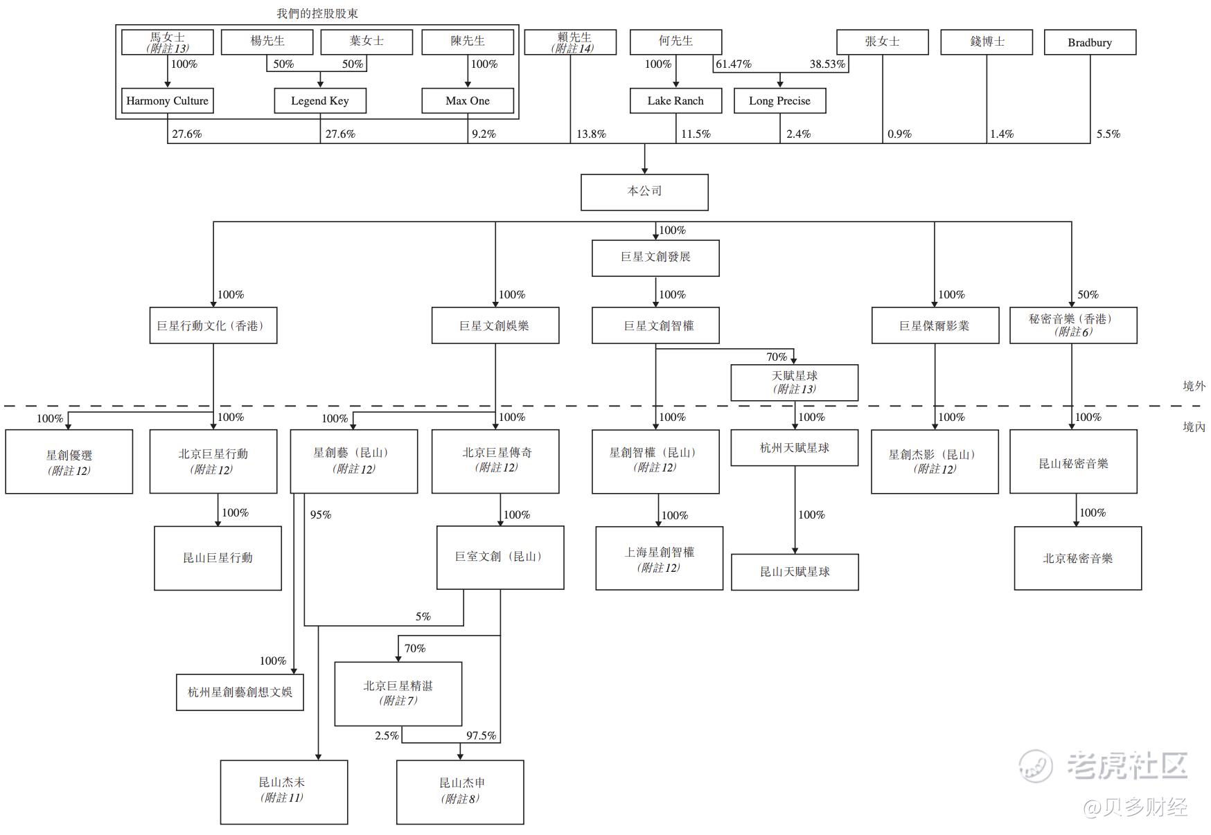 在本次冲刺上市前的股权架构中,巨星传奇董事会主席(即董事长)、执行董事马心婷通过Harmony Culture持股27.63%,杨峻荣、叶惠美通过各持50%的Legend Key持股27.63%,陈中通过Max One持股9.21%。据介绍,前述股东作为一致行动人合计持股64.47%。