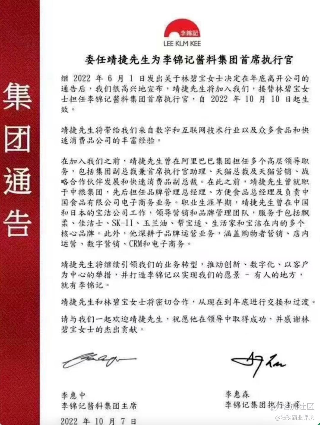 第二,从通告中可以看到,靖捷此前在宝洁、中粮、阿里等知名企业中,更侧重于市场营销和品牌建设。相较于林碧宝在业务发展、协作创新的优势,也折射了李锦记或将在品牌建设等方面发力。