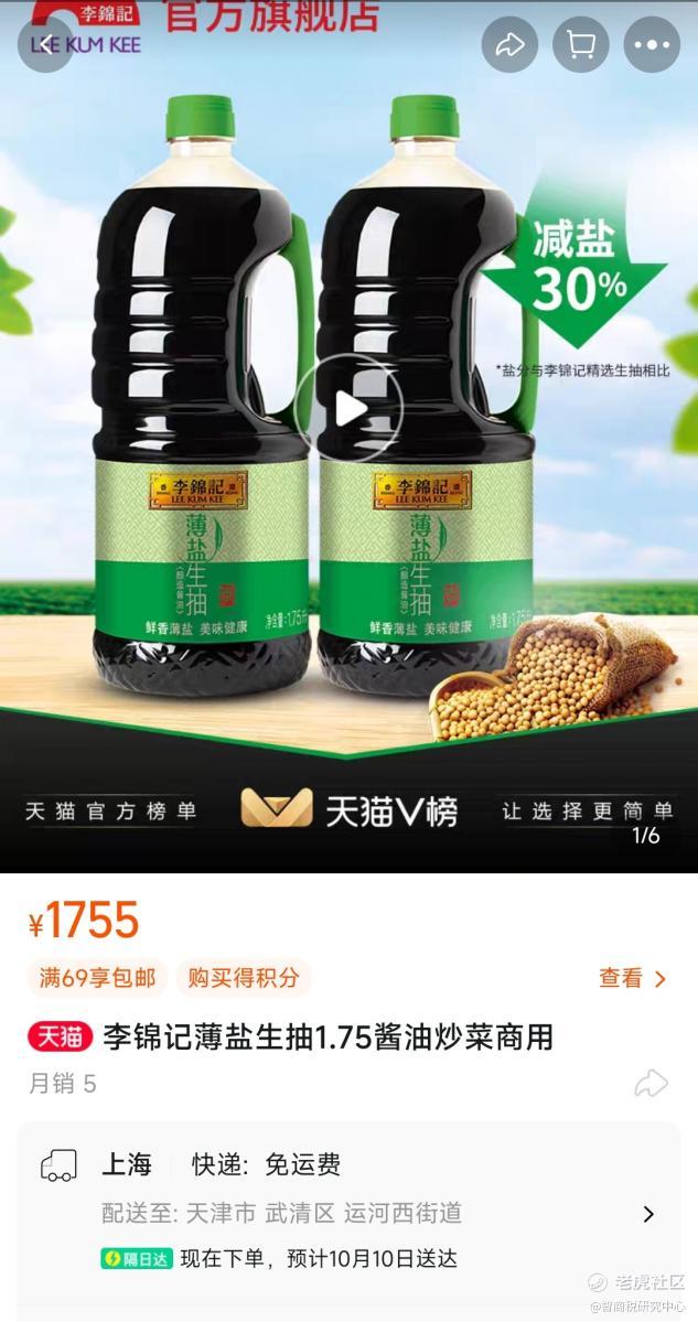 在天猫李锦记旗舰店,潘哥发现1.75升的薄盐生抽酱油,售价为1755元;咨询客服后,对方表示价格可能是运营设置错了,不推荐顾客购买这个。