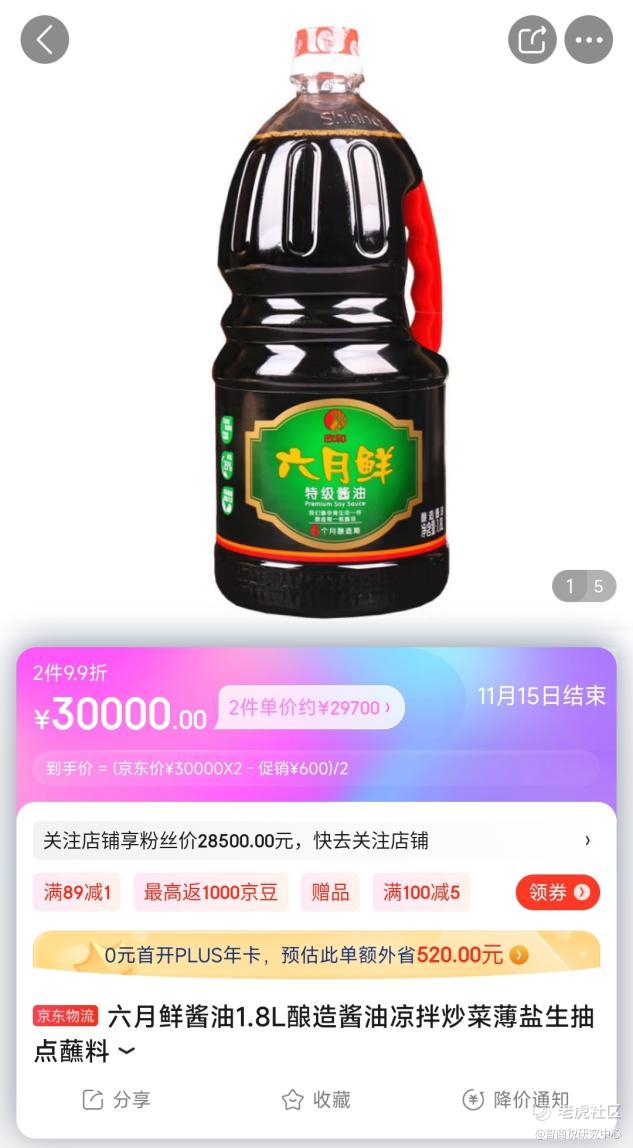 在京东上的某家店铺,潘哥发现1.8升的六月鲜特级酱油,售价竟然达到了3万元,享受2件9.9折的活动后,售价为29700元一瓶。