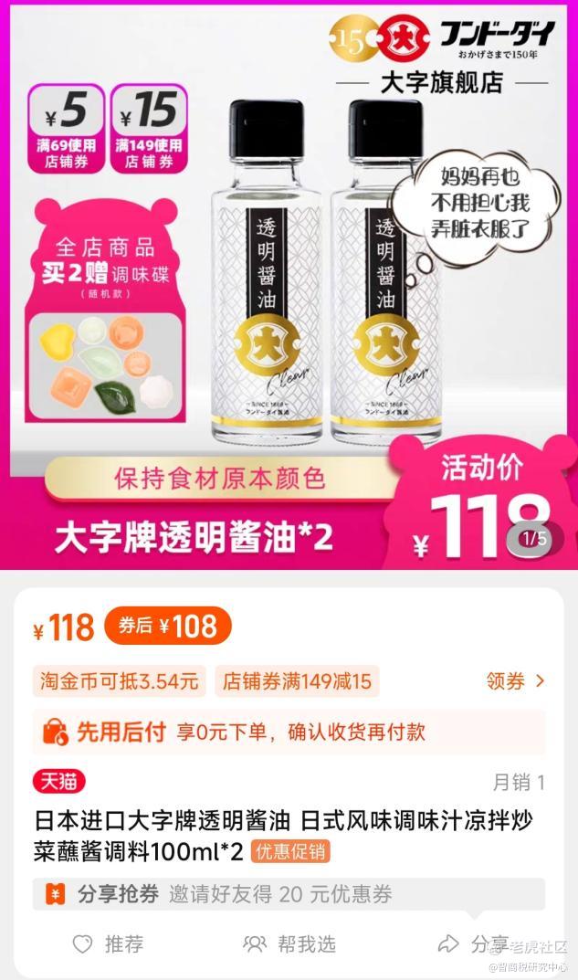 在淘宝上,两瓶100毫升的日本大字透明酱油,售价118元。客服告诉潘哥:“透明酱油虽然口感上没有多大差别,也是酿造酱油的风味,但是透明酱油经过脱色加工处理,会比正常的酱油工序繁琐很多。”