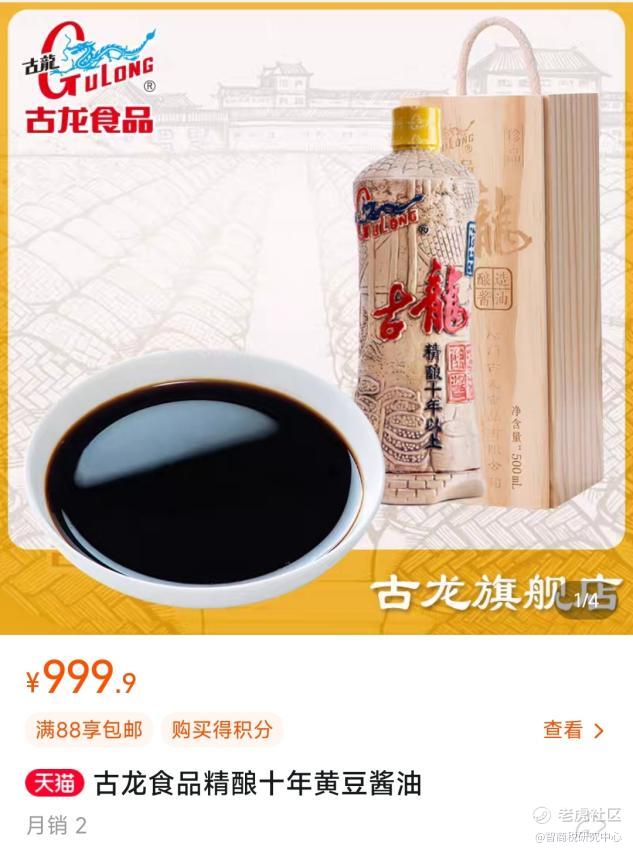 在天猫古龙食品旗舰店,潘哥发现500毫升一瓶的精酿十年黄豆酱油,售价达到了999.9元,只比千元少一毛。对此,客服向潘哥解释道:“这是十年的精酿,和普通酱油相比酿造时间不同,时间越久酱油酱香味越浓。”