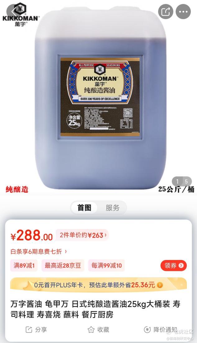 来自日本的万字酱油,拥有别具一格的桶装版本。在京东上,25公斤一桶的日本万字酱油,售价288元,如果购买两件,单价约为263元。