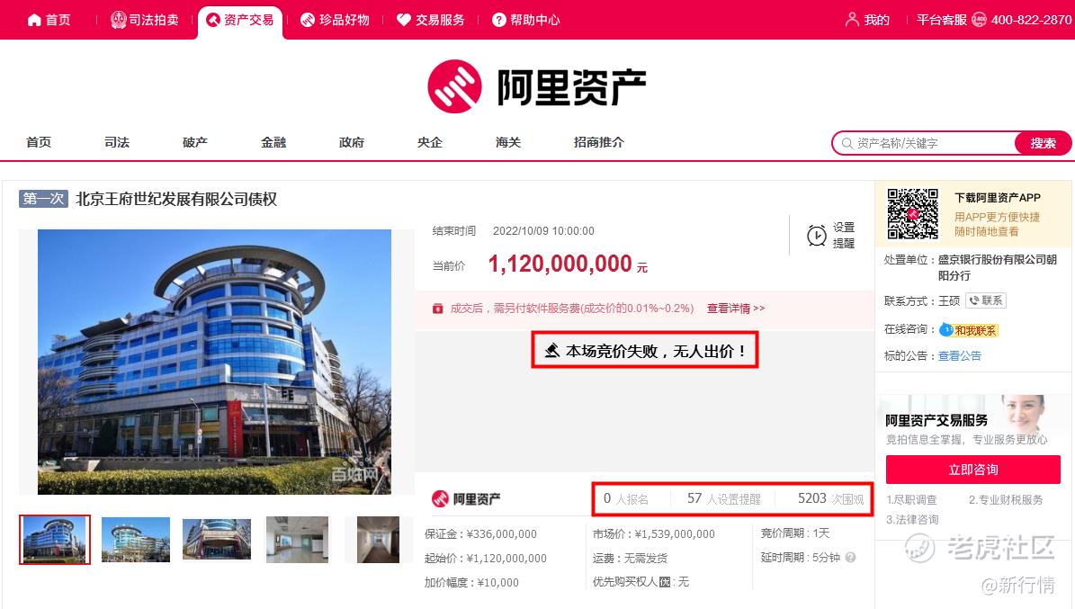 10月9日,阿里资产拍卖平台显示,北京王府世纪发展有限公司举行债权拍卖,其中的主要资产为王府世纪大厦,市场给出估值约15.39亿元,起拍价为11.2亿元,对应债权本金7.5亿元、债权利息3.7亿元。