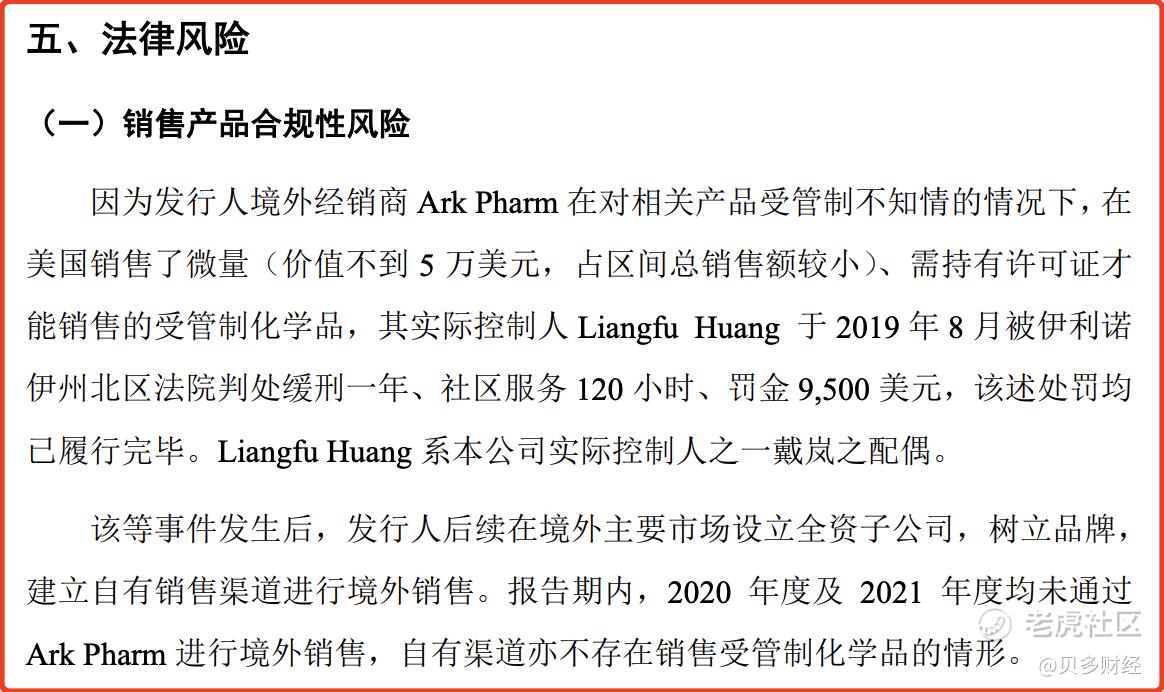 其中,毕得医药的境外经销商Ark Pharm因在美国销售了微量(价值不到5万美元)、需持有许可证才能销售的受管制化学品,其实际控制人Liangfu Huang于2019年8月被伊利诺伊州北区法院判处缓刑一年、社区服务120小时、罚金9500美元。