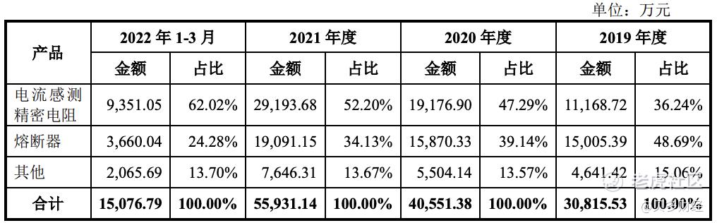 按产品类型来看,钧崴电子的收入主要由电流感测精密电阻和熔断器两个部分构成,其中电流感测精密电阻的贡献占比由2019年的36.24%分别增至2020年、2021年的47.29%、52.20%,并于2022年第一季度进一步增长至62.02%。