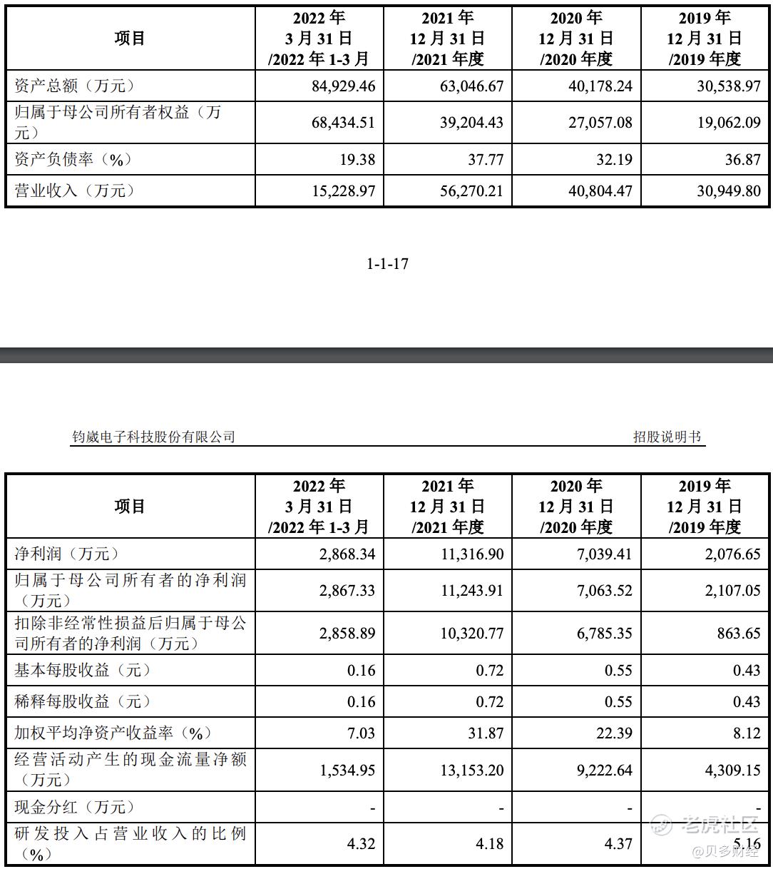 2019年、2020年、2021年和2022年第一季度,钧崴电子的收入分别为3.09亿元、4.08亿元、5.63亿元和1.52亿元,净利润分别为2076.65万元、7039.41万元、1.13亿元和2868.34万元,扣非后净利润分别为863.65万元、6785.35万元、1.03亿元和2858.89万元。
