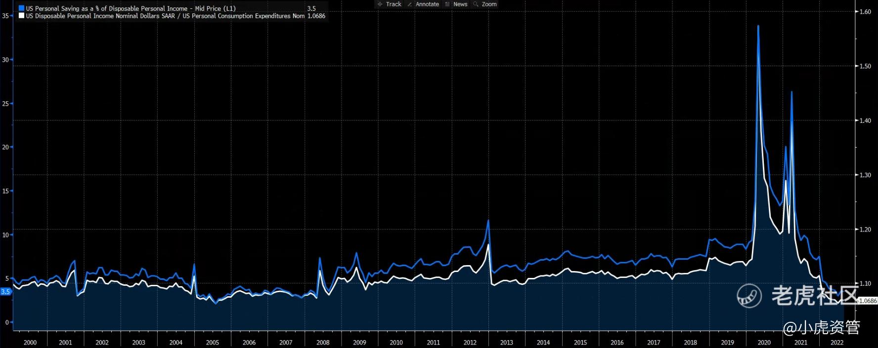 美国居民储蓄占可支配收入比例(蓝线)、居民可支配收入占消费开支比例(白线),来源:彭博