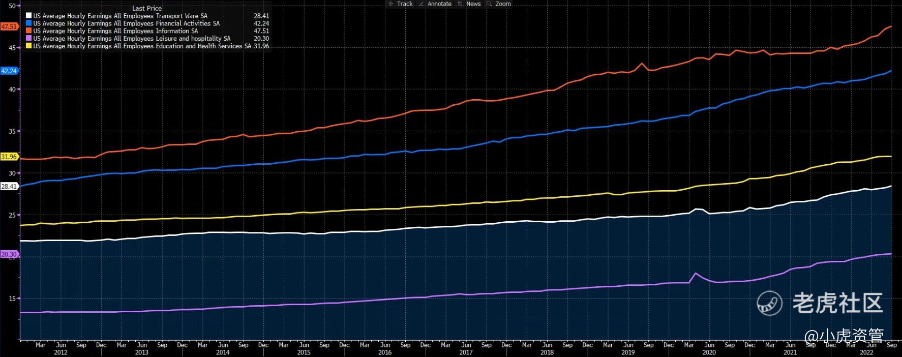 美国休闲住宿(紫线)、交通运输(白线)、教育医疗(黄线)、金融活动(蓝线)、信息技术(橙线)行业时薪,来源:彭博