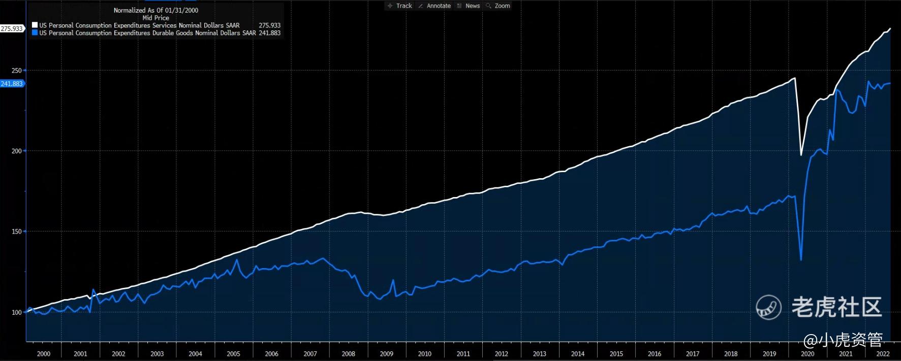 PCE服务(白线)、PCE耐用品(蓝线),来源:彭博