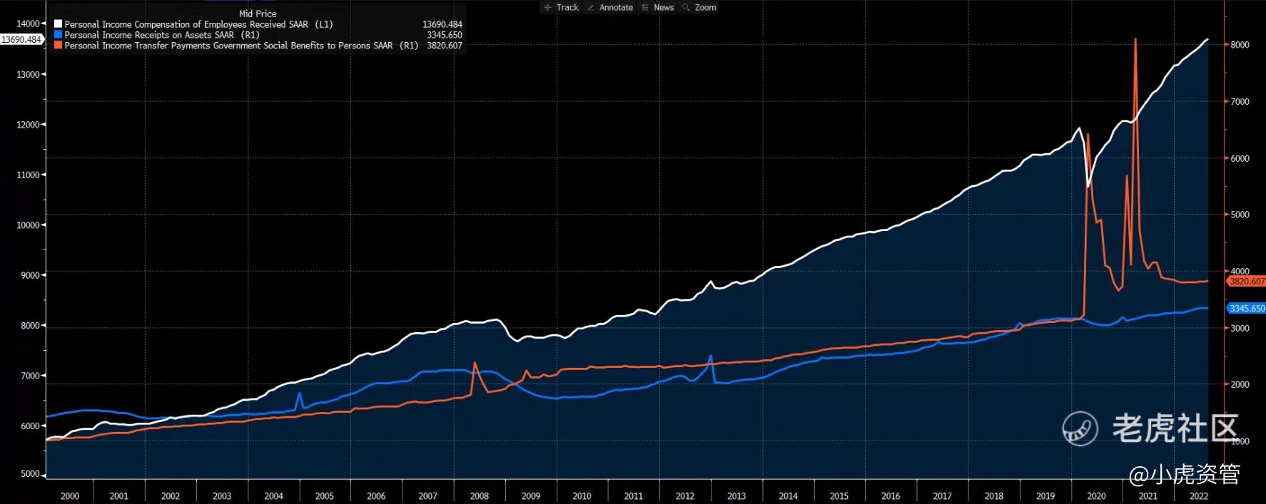 而从当前美国居民收入的组成来看,薪资的稳定增长是最主要的来源,政府发钱和资产收入(分红与利息)这两个因素贡献已经不大了。