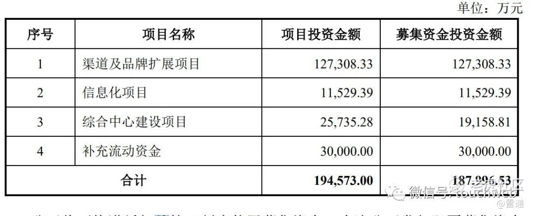 永兴东润曾计划募资18.8亿元,其中,12.7亿元用于渠道及品牌扩展项目,1.15亿元用于信息化项目,1.92亿元用于综合中心建设项目,3亿元用于补充流动资金。