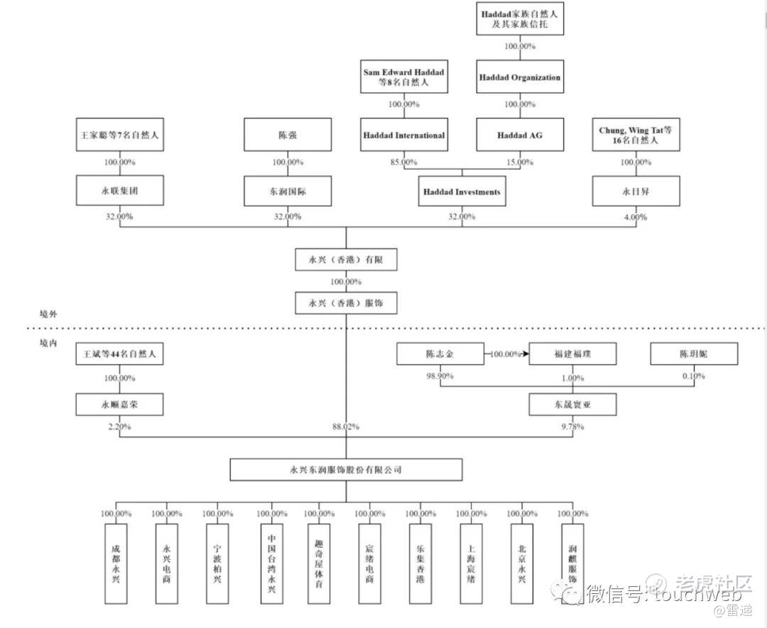 IPO前,永兴东润的控股股东为永兴(香港)服饰,其持有公司88.02%股权,永联集团、东润国际及 Haddad Investments各通过永兴(香港)有限间接持有永兴(香港)服饰32%的股份,穿透持有公司28.17%股份。